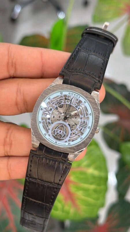 Gucci Skeleton Dial Automatic Watch – Silver Bezel with Black Leather Strap